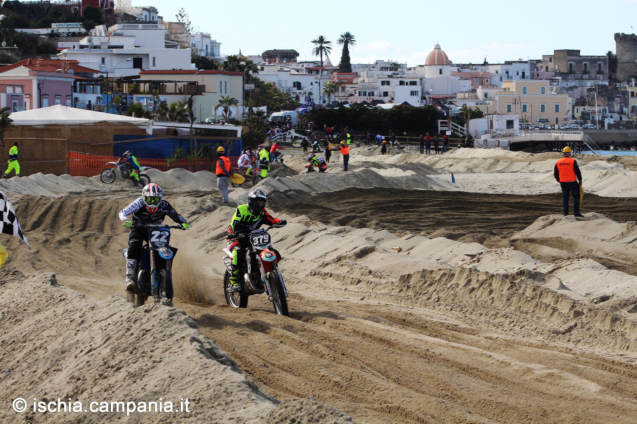 Ad aumentare il fascino dell’evento il paesaggio tutt’attorno. Parliamo del celebre skyline rappresentato dalla cupola della Chiesa di San Gaetano e dal Torrione, la più imponente delle torri saracene di Forio. Uno spettacolo che impreziosisce le gesta degli atleti in gara e chissà che non ispiri anche le evoluzioni in sella alle moto.