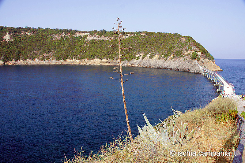Un cancello al termine della salita di Santa Margherita Vecchia dà accesso al ponte che collega Procida e Vivara. Poche centinaia di metri e si arriva a una scala in pietra che fu costruita negli anni ’30 per consentire alla principessa Maria Josè, moglie di Umberto II di Savoia, di visitare l’isola nella maniera più agevole possibile. Il ponte è di proprietà dell’Acquedotto Campano e convoglia le tubature che garantiscono l’approviggionamento idrico dell’isola d’Ischia.